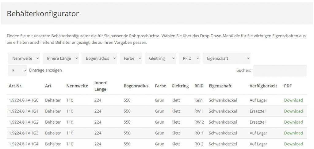 Sie sind sich bereits sicher, dass Sie ein Rohrpostsystem benötigen oder sind nur auf der Suche nach den passenden Behältern für Ihren spezifischen Zweck? Dann schauen Sie doch mal bei unserem neuen Behälterkonfigurator vorbei. Anhand verschiedener Parameter empfiehlt er Ihnen, welcher Behälter Ihren Vorstellungen entspricht.