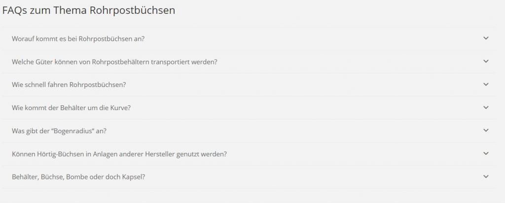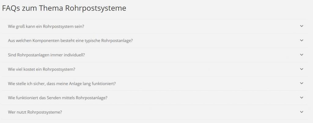Wussten Sie, dass wir unserer Website kontinuierlich Updates verpassen? Ab und zu vorbeischauen lohnt sich! In den letzten Wochen haben wir auf mehreren Seiten eine FAQ-Sektion gelauncht, die die meistgestellten Fragen rund um Rohrpostsysteme und Behälter anspricht. Gerade für Rohrpostneulinge und Interessenten ist der Bereich eine wertvolle Quelle für grundsätzliche Informationen.