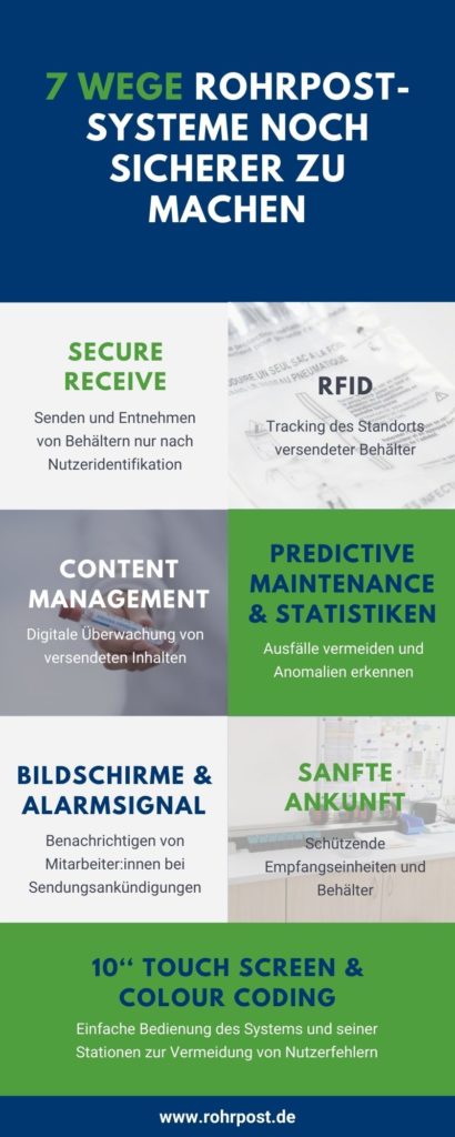 Ein verlorener Lieferschein mag ärgerlich sein, aber ist kein Weltuntergang. Bei einer nicht mehr auffindbaren Laborprobe im Krankenhaus sieht die Sache schon anders aus. Auch wichtige Medikamente sollten nicht in die Hände von Unbefugten gelangen. Für alle Fälle, in denen die Sicherheit des Transportprozesses eine besonders große Rolle spielt, setzen wir zusätzliche Sicherheitsoptionen für unsere Rohrpostsysteme ein. Diese bieten eine lückenlose Verfolgbarkeit der Chain-of-Custody und minimieren das Risiko