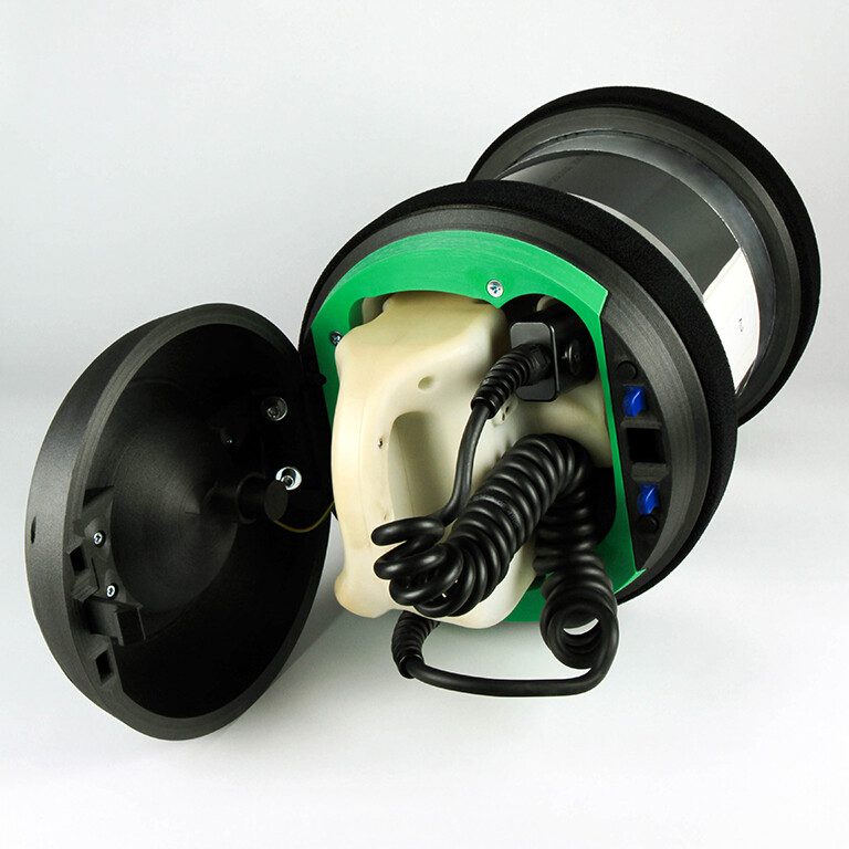 The carrier is a custom-made product because of its big diameter of 315 mm. The inside of the carrier was tailored precisely to the form of the eCATS. Thanks to the optimized closure mechanism, the users are able to open the carrier with only one hand needed. Contacts report to the station via RFID if the carrier was closed correctly.